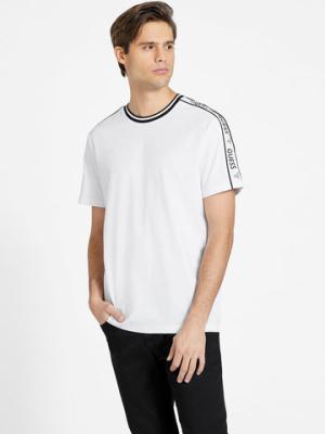 Men’s GUESS white T-shirt featuring a modern design with a branded logo tape along the shoulder for a sporty, stylish look.