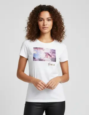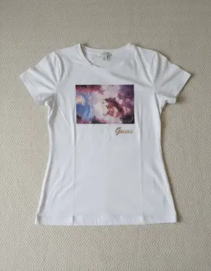 Women’s Guess white T-shirt featuring an elegant artistic graphic print with a gold Guess logo on the front. Designed with a flattering feminine fit, perfect for casual and everyday looks, and easy to style with jeans or leather pants.
