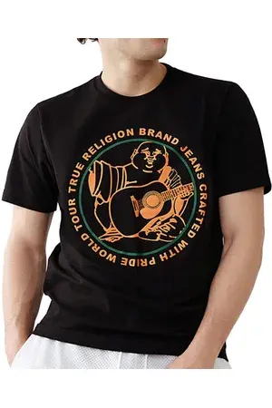 Men’s True Religion T-shirt in classic black, featuring a bold circular graphic print with the iconic guitar logo and True Religion branding. A statement piece designed for a modern, casual look with signature True Religion style.