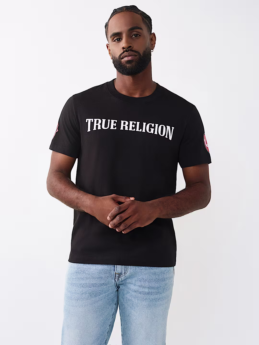 Men’s True Religion black T-shirt featuring a clean, classic design with the brand logo on the chest. Made from 100% premium cotton for a soft feel, breathability, and all-day comfort, perfect for everyday casual wear.