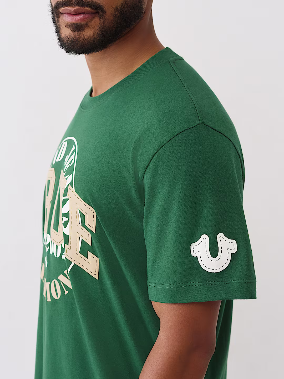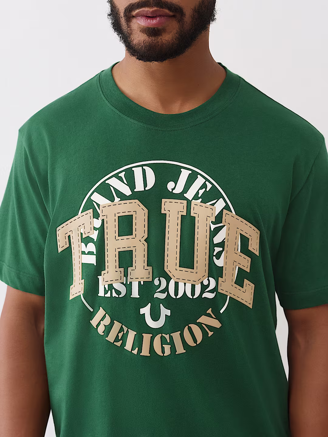 Men’s True Religion green T-shirt featuring the iconic TRU EST. 2002 logo for a bold and stylish casual look.