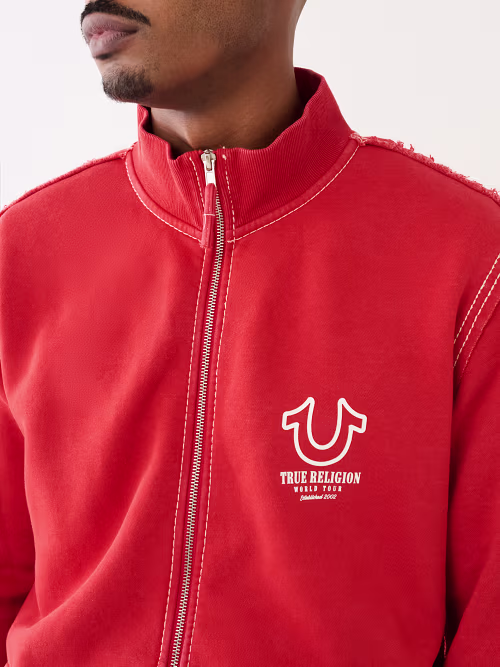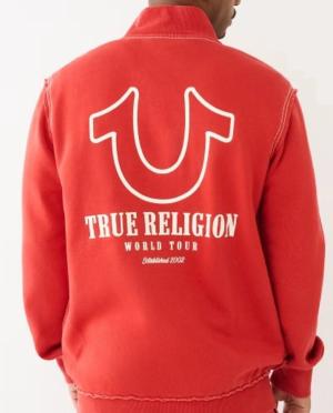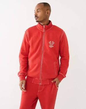 Men’s track jacket from True Religion in a bold red color, designed for both casual and sporty looks. Features a full front zip, stand collar, and the iconic True Religion embroidered logo on the chest. Made from 100% cotton for superior comfort, softness, and long-lasting quality.